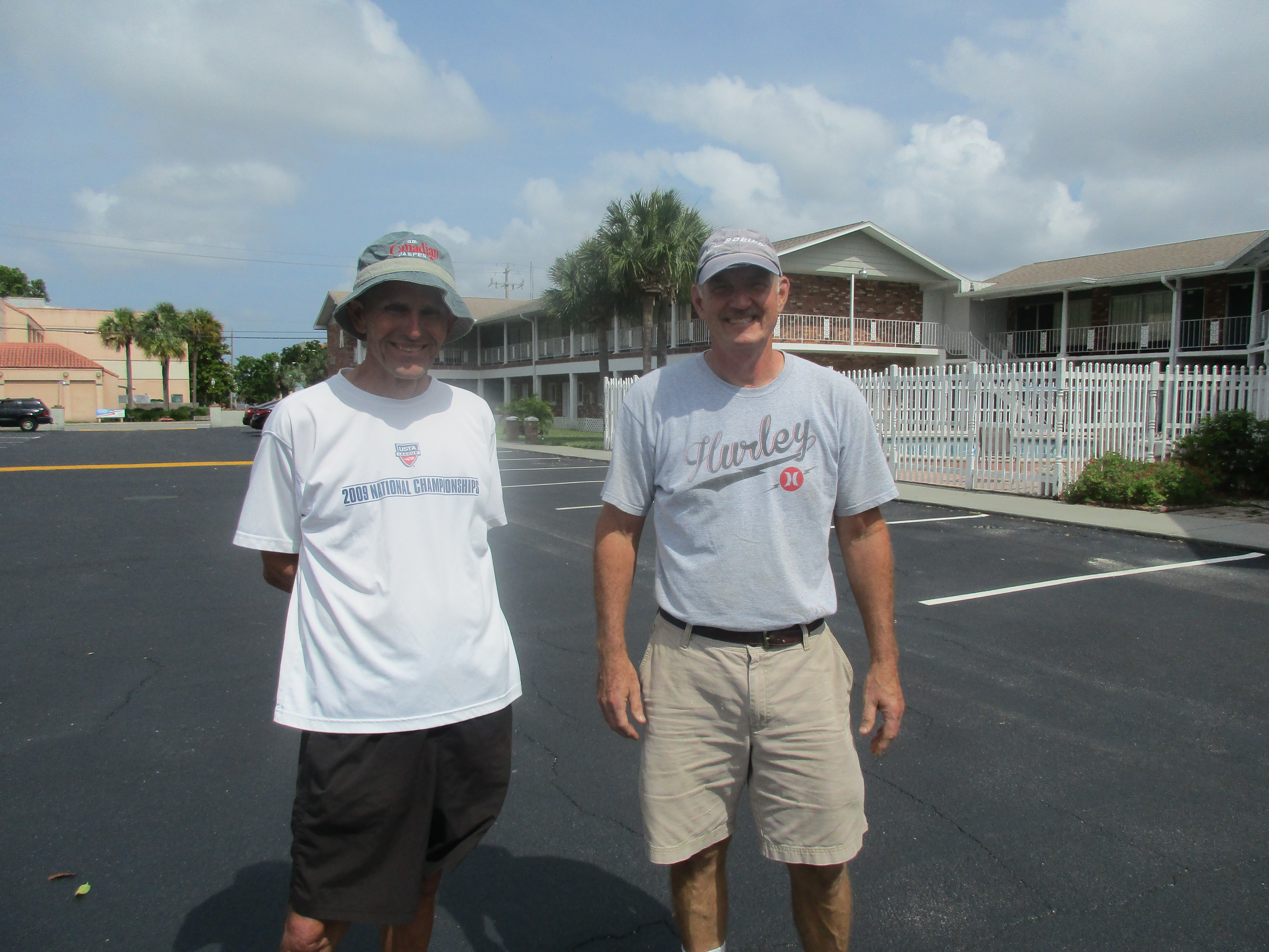 1st day for new mascot-large PINK MONKEY-SiSi (yes, yes in Sp)RIDES on top of my bag. Left SUGAR, TIGER, SNICKERS home-DOMINIC (my dog) chewed their ears off. Flat ride today, except for 2 not so hi bridges on A1A & HWY 1. Never saw so many $5,000,000+ mansions-perfect landscaping! 30m-stop for ch milk & ch muffin. Stop to take 1st picture-try to lift leg up over Si Sì-leg cramps-20 yrs last time leg went so hi. OW OW-Come take picture fast. Cant lift leg to get back on bike. Now we go up bridge-cramps again-have to walk. Stop for gatorade. Still feel cramps are close. Stop at Su bway-feel better. Armand is ready to stop. Can’t find laQuinta-see JUPITER WATERFRONT INN-anything w/water in name going to be expensive. Try anýway. Standing under tree-very hot now 3:00-He yells $109-YES, before price goes up-price in room says up to $400. Best room we’ve stayed in on bike trip-swimming pool, hot tub, bay rt outside rm. Swim, lay in sun-not hot now-listen to music-thought I could listen to it on bike. 1st time we’ve swam-TODAY HAS BEEN A WONDERFUL 1ST DAY!