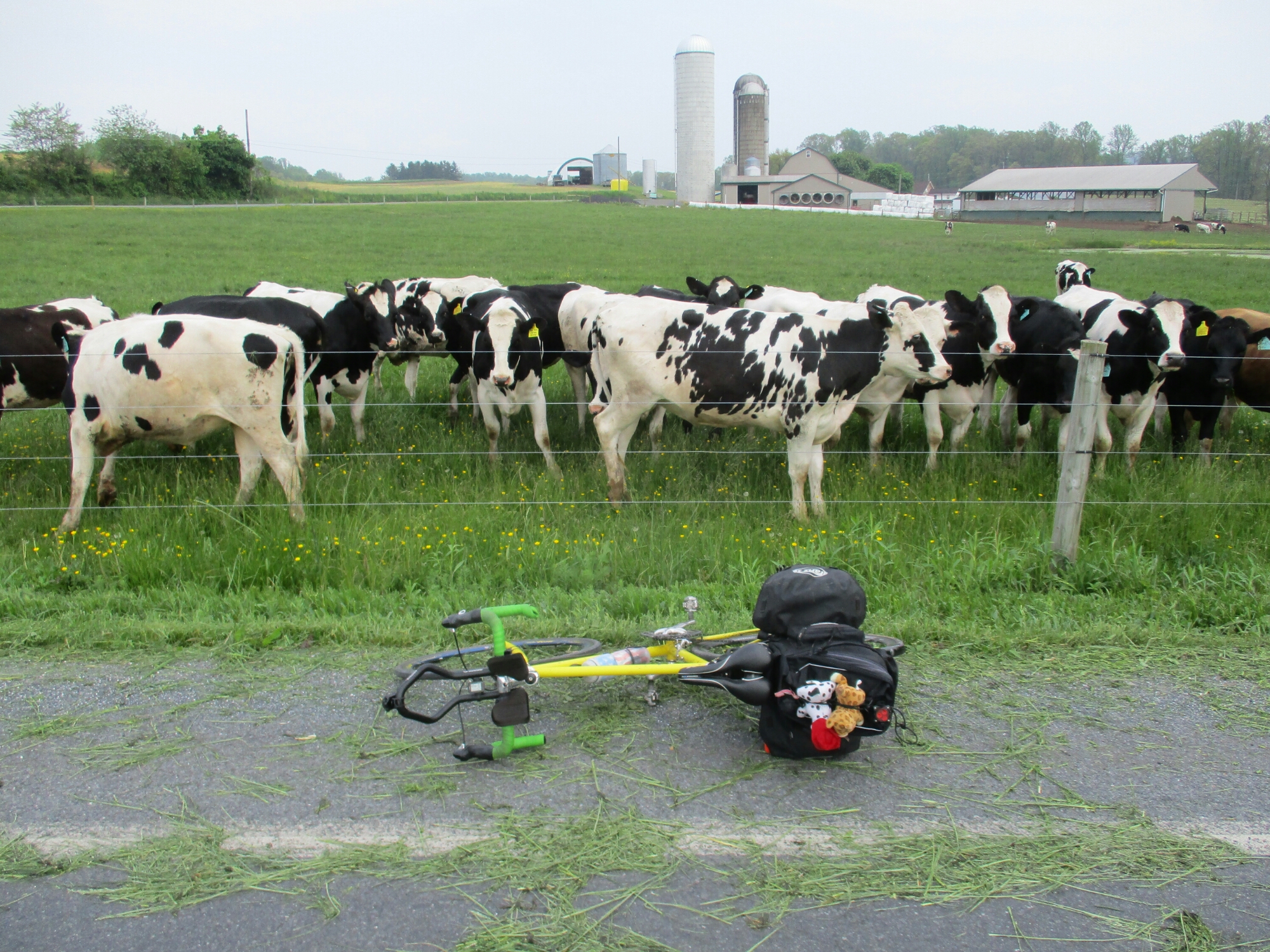 DAY 27 (5/12-THURS) MARIETTA to PHOENIXVILLE, PA 70 MILES, 11 MPH, 6:20 BT 9:30 to 8:00 FASTEST SPEED EVER 39.6 LONGEST DAY FRENCH CREEK INN $90. Late start-thick fog-too dangerous to be on rd. Jacket comes off in 2 m. Beautiful farm lands, horse & cow farms-continual climbing. Large Amish & Mennonite communities-very impressive. See cows close to rd-stop for picture. Etta gets off tractor to talk to me-get cows at 500 lbs-fatten & sell for steaks. Tell her OR is vegan-his father was butcher. Her husband was cleaning up piles of manuer after days of rain-also sells food to feed cows. They’re Mennonites & daughter is in Coast Guard stationed in WA. In 30 m see golf course-want to stop OR? No-keep going. Made wrong term-2 men stop to help. Hungry-stop at gas station-eat hot dog on curb. Now on beautiful country rd-38 m-OR starts down long downhill. POW-SNAP-LOOK DOWN-CHAIN IS LAYING IN RD😂😂😂. What to do-think I can coast downhill. Look to my rt-see RTauto repair shop. In over 10,000 + m-never saw auto repair shop on back country rd. Go in-Terri comes out-I’m holding chain-hands black-explain problem. OR bikes up-2 ladies in car honked & told him I had accident. Terri takes OR to bike shop (3 m-a lot of Mennonites ride bikes). Husband Randy says owned shop for 40 yrs, daughter is 2nd grade teacher. Help put links in my chain & back on bike-no charge. THERE ARE BIKE ANGELS & THERE ARE MIRACLES. THANK YOU TERRI & RANDY. THANK YOU GOD. Back on rd-see huge rv camp-really wanted to get something to drink-OR too far in front. Going up mt-POW-SNAP-OR’S CHAIN IS LAYING IN RD😂😂😂. Pull over-thank goodness he bought another $3 link. OR is down on ground, hands black-doesn’t like to be dirty. I want to call Terri for help again-OR drops little link-can’t find it. DON’T MOVE-see link on leg. 5:00-chain is fixed-both biking again-still 25 m to go. Out of water-little towns have several churches-no place for drinks. Stop at FIRE STATION-no one home-just left on call. See lady in driveway-gives us 2 bottles of water-her cat comes over & sits by us. Can’t describe how difficult biking is. Hungry again-come to fancy rest in middle of no where. Talk to lady coming out-must have really felt sorry for me-offered to give me left over pizza. Can’t believe I took it-go in & get $3 root beer. Can go now. Finally at 8:00 PM-we come to 1st motel-French Creek Inn. Another large & clean motel. OR walks to Italian Rest-I have pizza. Eat in room. Made it through another day with a lot of help.
