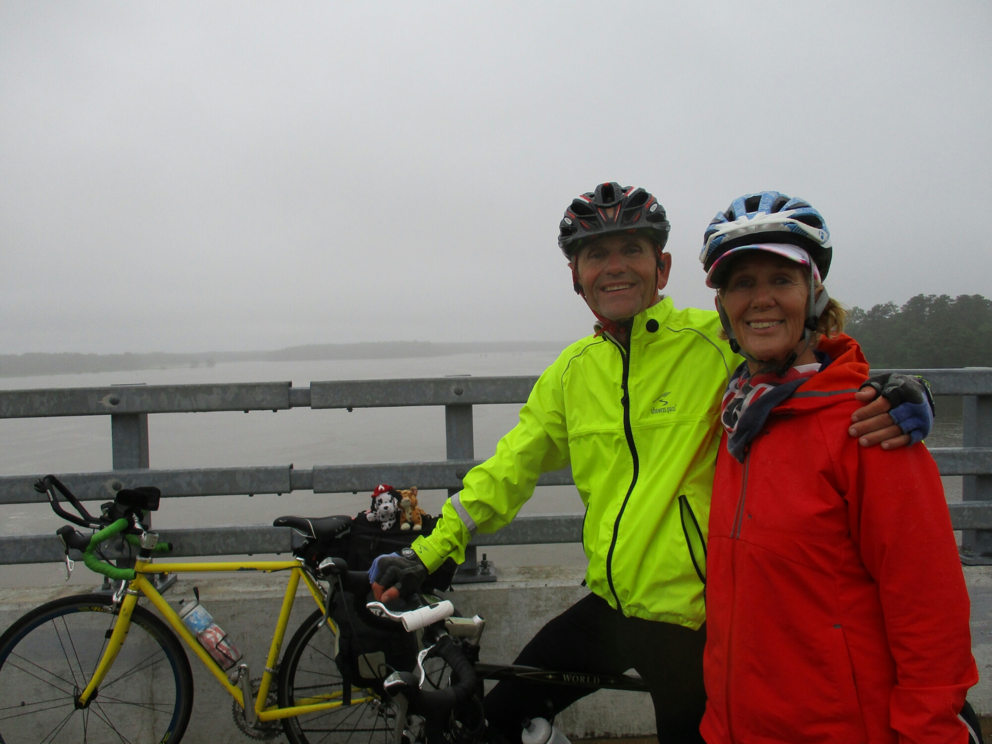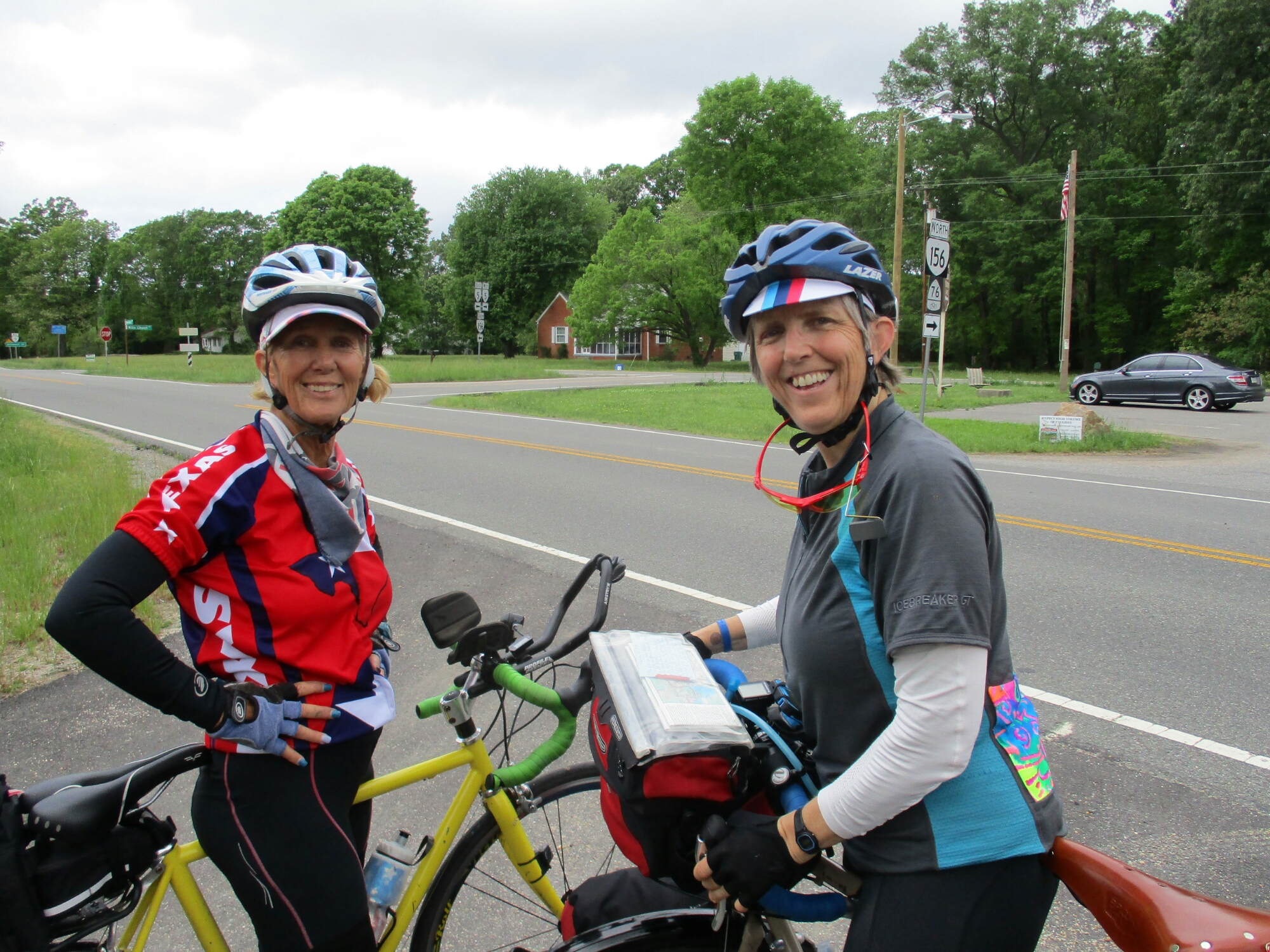 SUFFOLK to WILLIAMSBURG, VA 57 MILES, 12.3 MPH, 4:38 BT, 9:00 to 4:30. ECONOLODGE LODGE $60. Up after 8-still sore from fall. Went wrong way-man said he would show us way. 9:45 when we finally get out of town. Absolutely beautiful-finally have hills. Oh-oh, starting to rain-keep going. Just get to 1st little corner store we’ve seen in 40 m. Eat hot dog so I can stay inside-pouring-man says rain until 3 AM. People come from church-get beer & scratch offs. Rain lets up-off we go. Steep downhills-afraid because rds wet. Get to ferry at 2:45-ready to load-1st ones on. Free-2 ferries go back & forth 24-7. Get to Econolodge-$60-very nice-huge room w/double sinks. Lost shoe today-go to KMart next door. Buy shoes, UT buys golf shirt & shaving cream. Has not shaved on trip. Tomorrow Fran is coming from VA Beach to visit us. She is my hero-met her in 2002 going cross country when she was 69-she is still biking more than me. Tomorrow Whitney gets here to start his trip to OR. We have rest day.