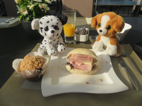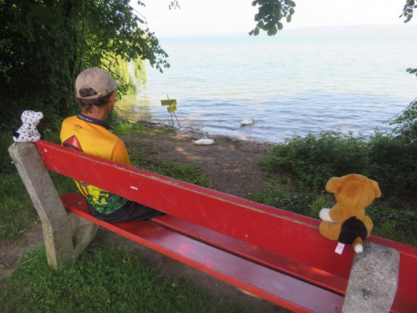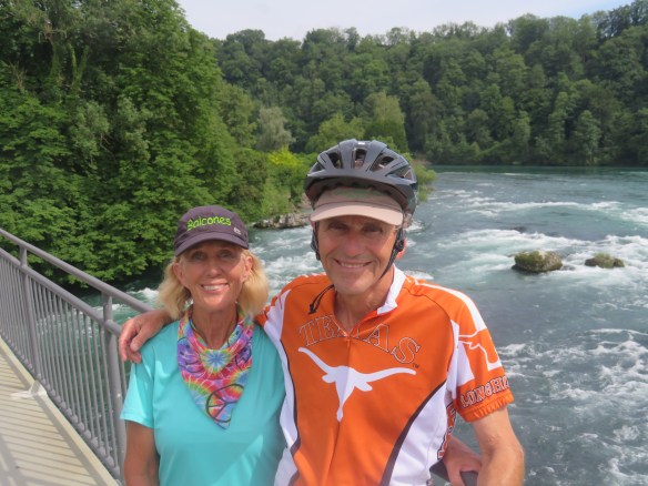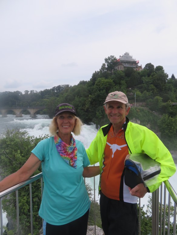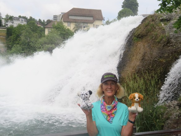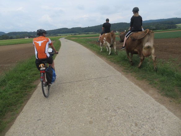 Hard to write about yesterday. Started out w/Cindy. Since bike trail was closed-suppose to have tough climbs out of town. My 1 good idea-take same walking path to waterfall (yesterday)& cross bridge. Pictures also appeared from yesterday. Going to be our longest day-Cindy stayed @ castle where cows were. On roads-little traffic,bike paths-gravel & good tree lined trails-steep climbs-rivers & farms. Little bit of everything. Cindy found us again-eat lunch on bench w/coke. Now going around Zurich airport-why would they have us go here? Cindy & UT have map meeting-going wrong way-go back 4 m. Meet lady on trail w/5 dogs-speaks English. She’s a nurse-takes her 5 therapy dogs to work everyday-15K (9 m)gets home & rides horse. Thunder & lightning-different rt #s to try to follow.Zurich traffic is unbelievable-find tunnels under rds. Now pouring-UT finds us a porch-stay over an hr. watching famlies biking by. Decide to go-very difficult to bike in Zurich-finally find hotel Sorell-Sparky & Wilson are so glad to be here-9:00 PM. Jean got here 3:30-before rain. Eat Thai w/Cindy. Can’t write anything.