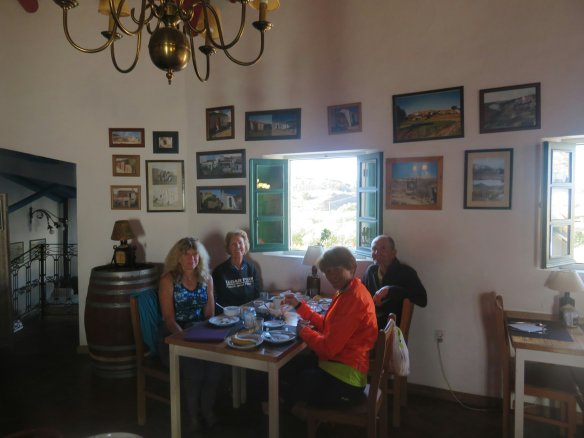 Every day is different. In mt country-see no one on trails-landscape so different from yesterday-no flower fields or covered hot houses. Armand’s gps doesn’t work๐ข Follow Jean out of town-later follow Cindy. Steep climbs-FALL off bike for 3rd time. ๐ฃ๐ฃ๐ฃ 2,200 ft of elevation on gravel & dirt 70% of time. Weather is not hot & wind at back most of time-long downhill to ALDELA DA PEDRALVA. Town of 18 residents only got electricity 10 yrs ago. Very nice room-2 floors-such nice people here-excellent meal. Tomorrow last day of biking.