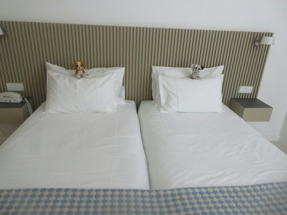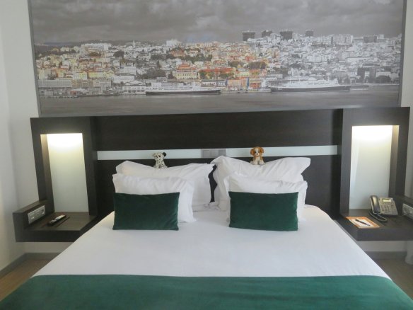 JUPITER HOTEL in Lisbon-hotels we have stayed in have been unique & fantastic w/excellent bkft. Found a Mexican restaurant for our last meal. Cobblestone w/black is typical everywhere. Our last picture on 8th floor w/pool. Ready to leave at 8 tomorrow. What an adventure-how blessed we areโบโบ
