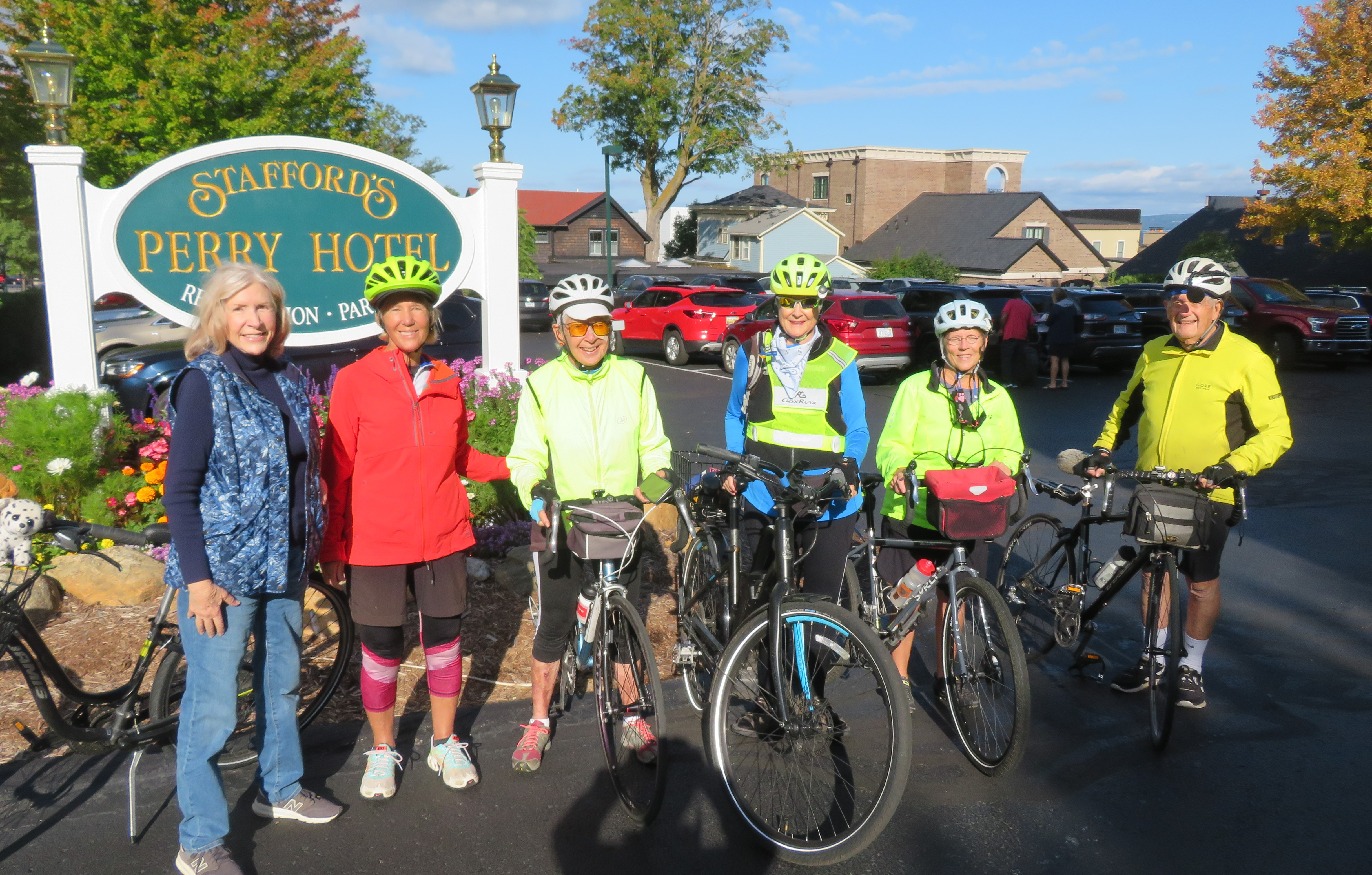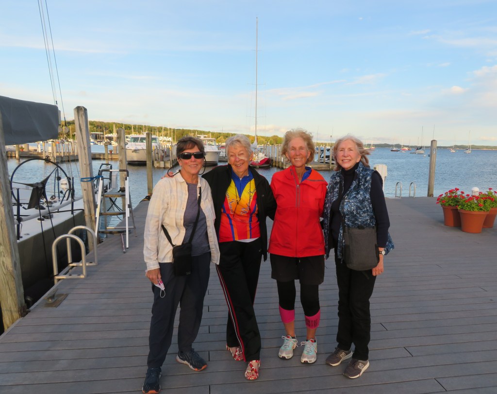 SEPT 13 (MONDAY) ANNE is our driver-after going wrong way (rd under construction was clue) we made it to the ferry. Did I mention-weather is cool & perfect. Island is famous because NO cars allowed. ANNE, LYNN, DONNA & I took horse carriage tour. FRAN (who had already done this before) geocashed ??? She looks for hidden objects. We had dinner w/FRAN’S daughter DAPHNE who is a geologist & DAVID who we met on the trail. They are in a huge RV, pulling car, bikes & motorcycle. I showed video of BIKER reunion in ATLANTA, hosted by LYNN in 2020. In 2002-goal was to get in 1st: Now in 2021
