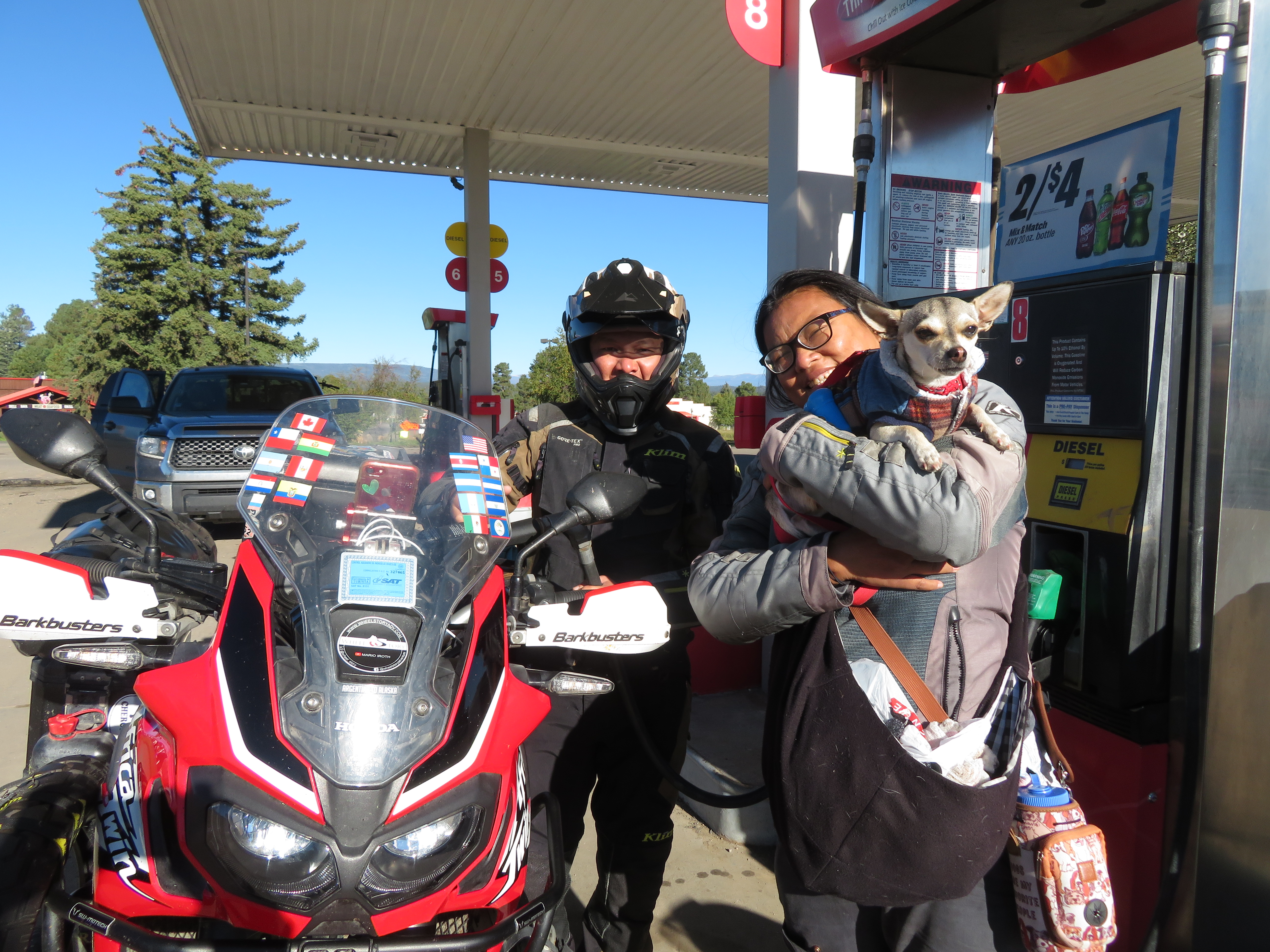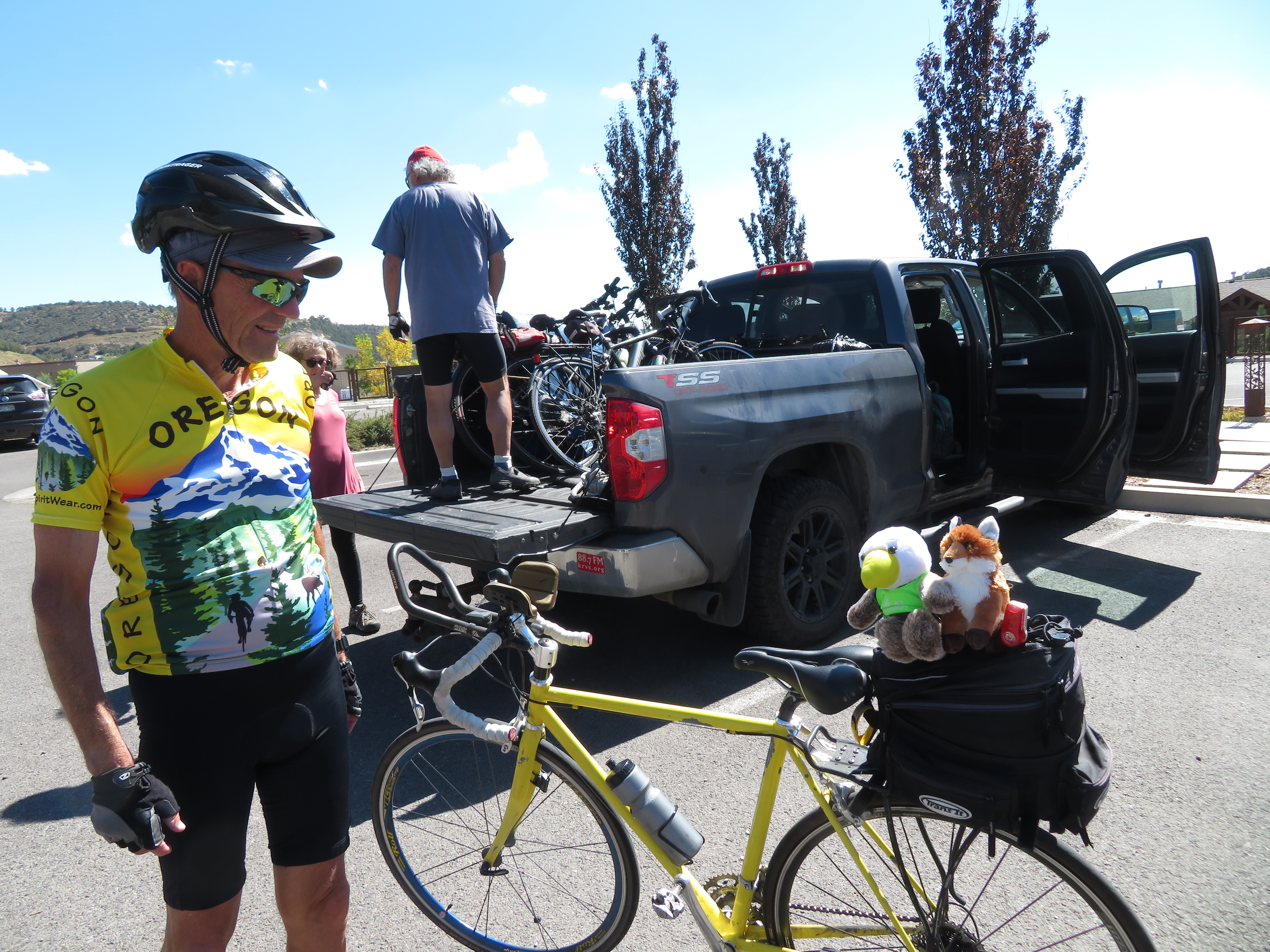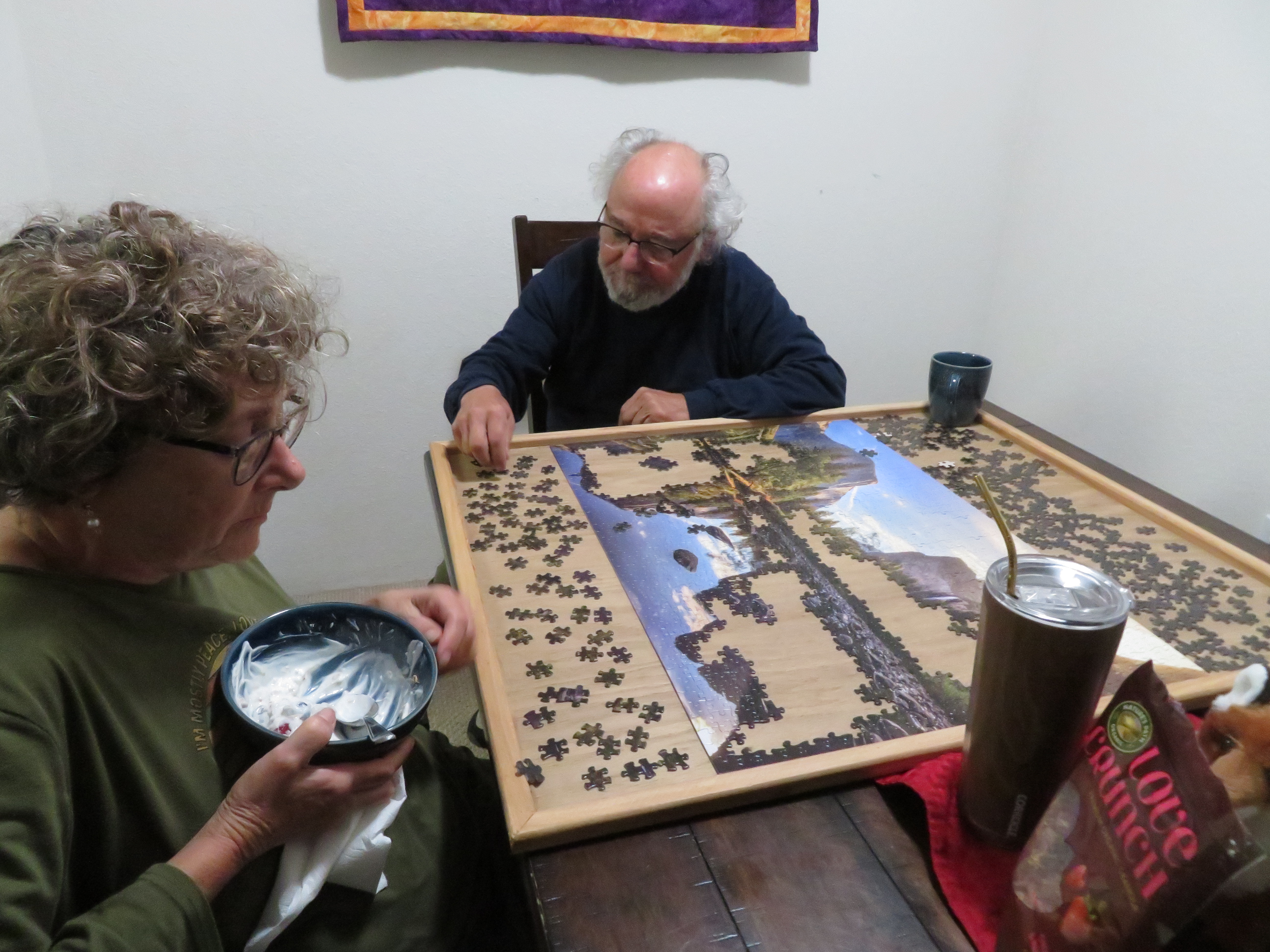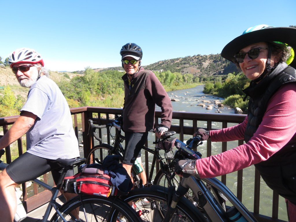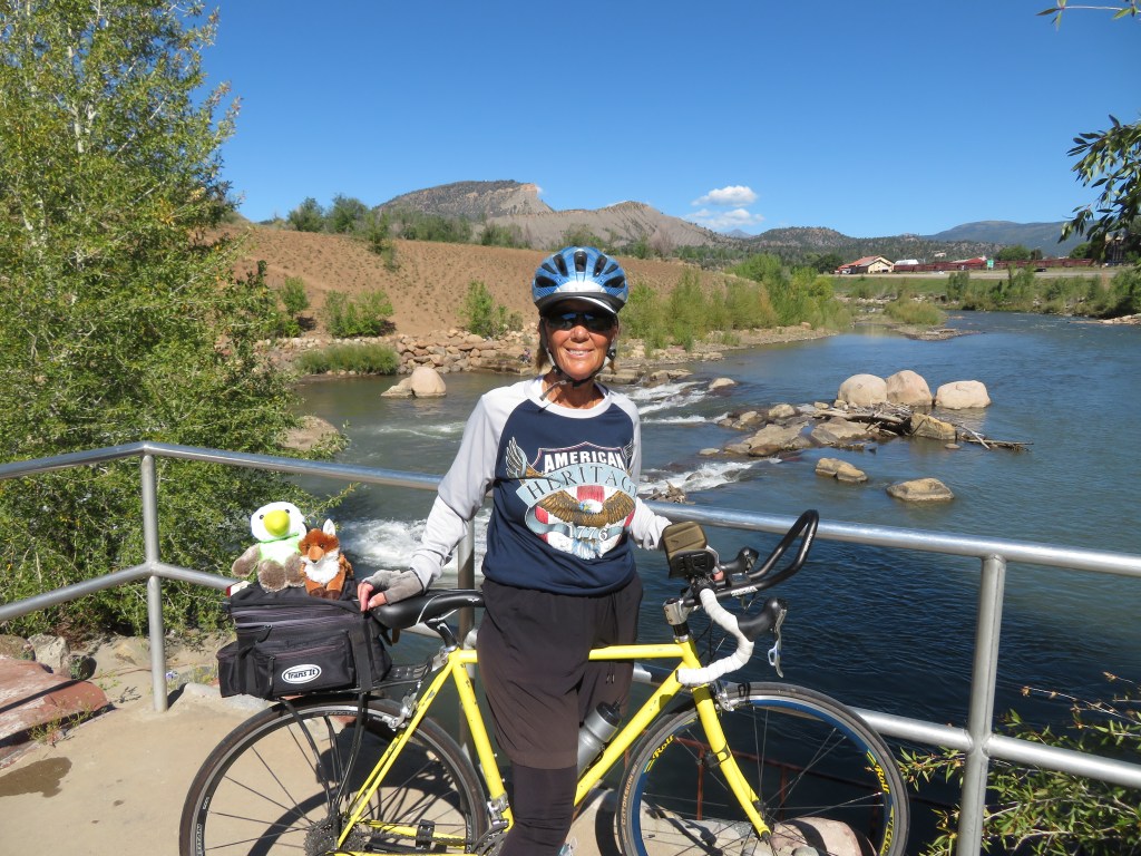 Loaded bikes in Whitney’s truck & drove to DURANGO. Filled up w/gas & saw a couple on a motorcycle in front of us w/a little dog. Asked to take their picture-dog goes everywhere with them. Parked at Home Depot, unloaded bikes. Biked 18 miles along scenic bike path that followed the river. I think Whitney probably isn’t used to stopping so many times for me to take pictures-but he was a very good sport about it. Came home, took nap while they worked on 1,000-piece puzzle. Molly & Whitney cooked another great meal-took walk. Now writing blog while they are working on puzzle.