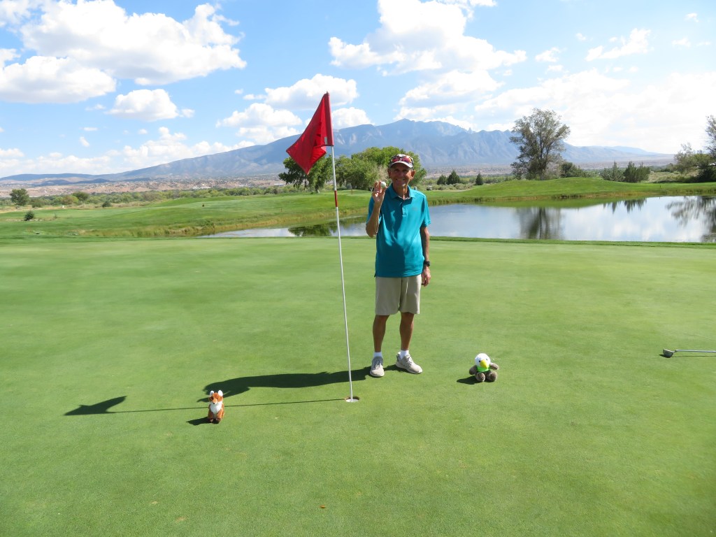 Casino opened at 8-1st ones there. I lost my $5 in 5 min. Armand made $.04 on his $5 in 15 min. Went to Santa Ana Golf Course-Armand had a great day on a beautiful course. Made an EAGLE on hole #18 (par 5) by sinking an 80 yd chip. Drove to Albuquerque to stay with friends David & Johanna. Went out to eat at the Range & ended up in their hot tub. Another nice day even though we miss Whitney & Molly.